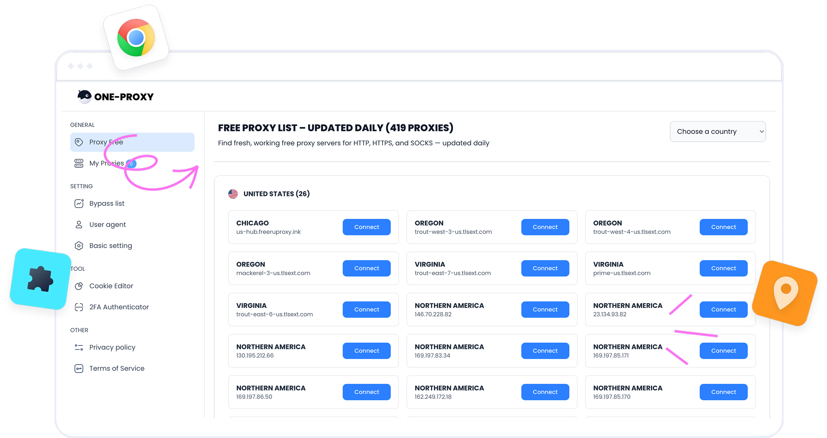 Free VPN proxy servers in 50+ countries. Easy switching with OneProxy Chrome extension.